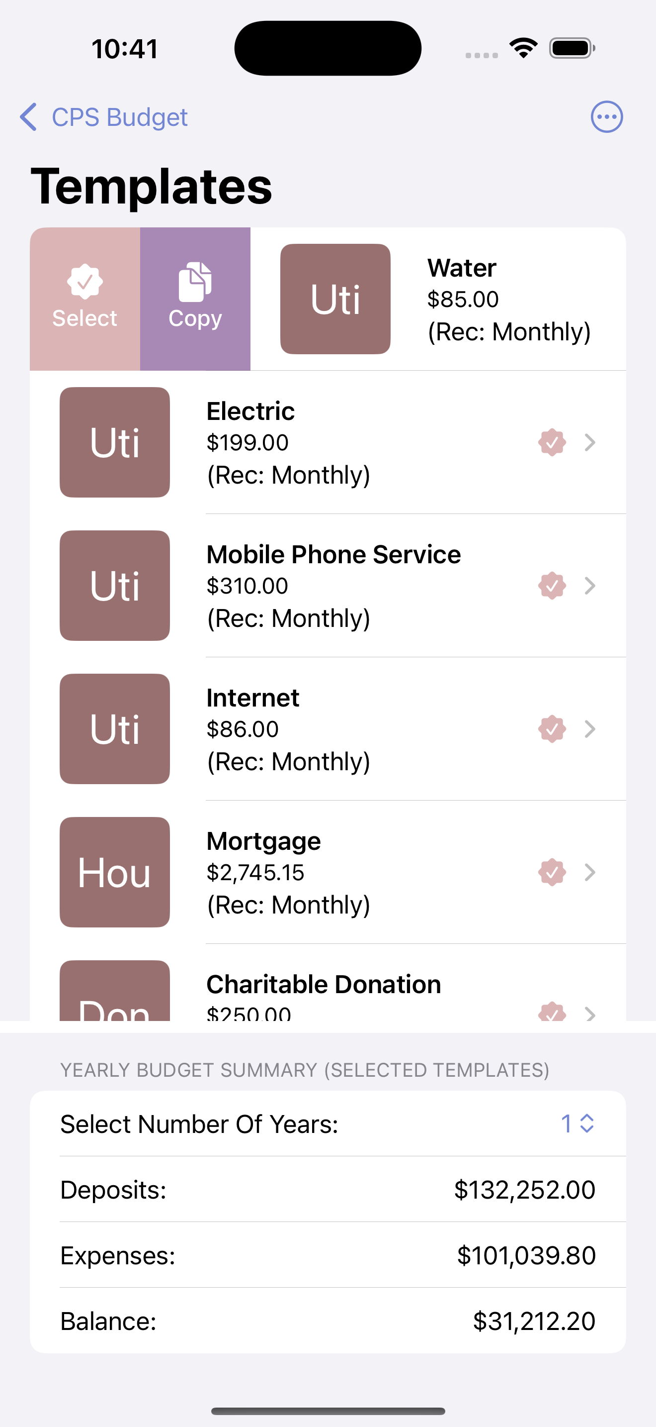 Go to Templates and load the sample data. This section contains very common budgeting items for a typical household. You’ll use these to generate monthly budgets. You can customize these items to reflect your actual budget and/or add new ones. Swiping right exposes Select and Copy features.