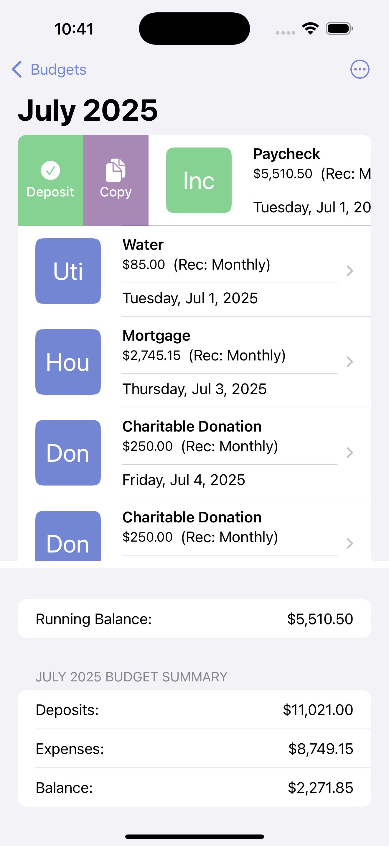 Go to Budgets and select the current month. You’ll see the list of budget items you created for that month. Now, from here you can work your budget on a daily basis by clearing items as paid or deposited and adding new items as well. Swiping right provides quick access to Deposit, Payment, and Copy features.